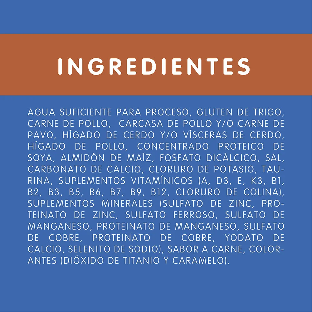 Agua suficiente para proceso, carne de pollo congelada, gluten de trigo y/o harina de soya y/o harina de menudencias de pollo, vísceras de pollo y/o vísceras de cerdo congeladas, almidón de maíz, carne de sardina congelada, glicina, dextrosa y/o xilosa, fosfato bicálcico, sal*, inulina, vitaminas (A, B1, B2, B3, B5, B6, B7, B9, B12, D3, E, K3), cloruro de potasio, taurina, minerales [(sulfatos: zinc, hierro, manganeso, cobre), minerales de alta absorción/quelados (proteinato de zinc y/o complejo de zinc glicina, proteinato de hierro y/o complejo de hierro glicina, proteinato de manganeso y/o complejo de manganeso glicina, proteinato de cobre y/o complejo de cobre glicina, proteinato de selenio y/o complejo de selenio glicina), yodato de calcio, selenito de sodio], carbonato de calcio, cloruro de colina. *Sal (mín./máx.) 0.1% / 0.6%.