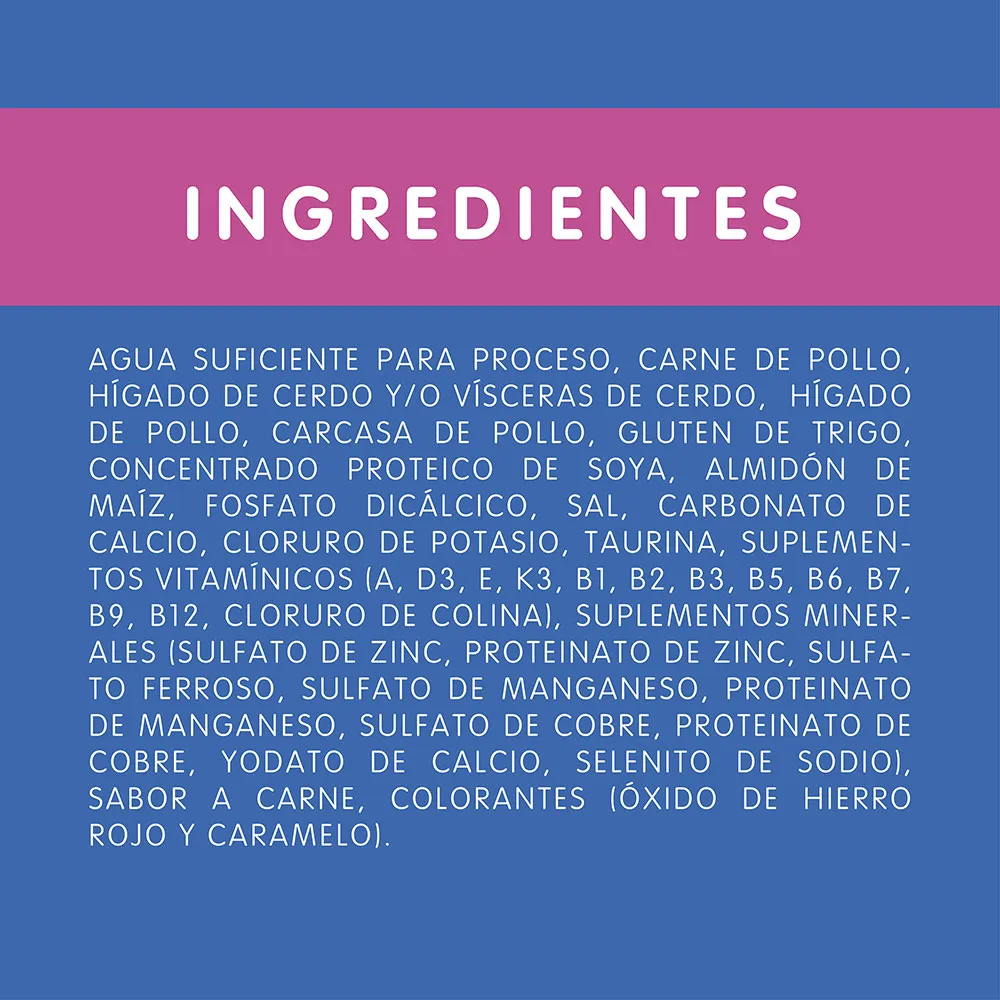 Agua suficiente para proceso, carne de pollo, gluten de trigo y/o gluten de maíz y/o harina de soya, carne de pescado (sardina y/o tilapia y/o atún), almidón de maíz, ortofosfato y/o carbonato de calcio, hígado y/o corazón de pollo, hígado y/o vísceras de cerdo, saborizante cárnico artificial y natural, sal**, vitaminas (A, D-3, E, K-3, Complejo B, cloruro de colina), cloruro de potasio, taurina, minerales , levadura de cervecería inactiva.