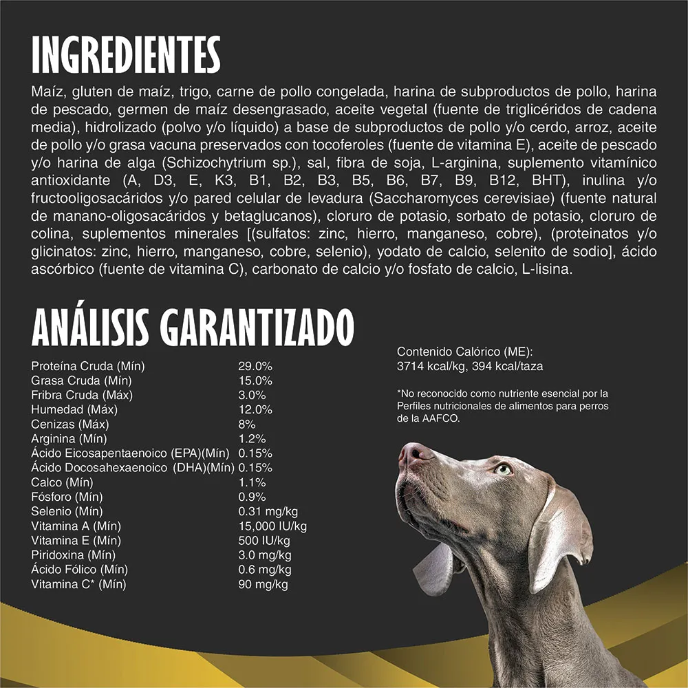 Maíz, gluten de maíz, trigo, carne de pollo congelada, harina de subproductos de pollo, harina de pescado, germen de maíz desengrasado, aceite vegetal (fuente de triglicéridos de cadena media), hidrolizado (polvo y/o líquido) a base de subproductos de pollo y/o cerdo, arroz, aceite de pollo y/o grasa vacuna preservados con tocoferoles (fuente de vitamina E), aceite de pescado y/o harina de alga (Schizochytrium sp.), sal, fibra de soja, L-arginina, suplemento vitamínico antioxidante (A, D3, E, K3, B1, B2, B3, B5, B6, B7, B9, B12, BHT), inulina y/o fructooligosacáridos y/o pared celular de levadura (Saccharomyces cerevisiae) (fuente natural de manano-oligosacáridos y betaglucanos), cloruro de potasio, sorbato de potasio, cloruro de colina, suplementos minerales [(sulfatos: zinc, hierro, manganeso, cobre), (proteinatos y/o glicinatos: zinc, hierro, manganeso, cobre, selenio), yodato de calcio, selenito de sodio], ácido ascórbico (fuente de vitamina C), carbonato de calcio y/o fosfato de calcio, L-lisina.
