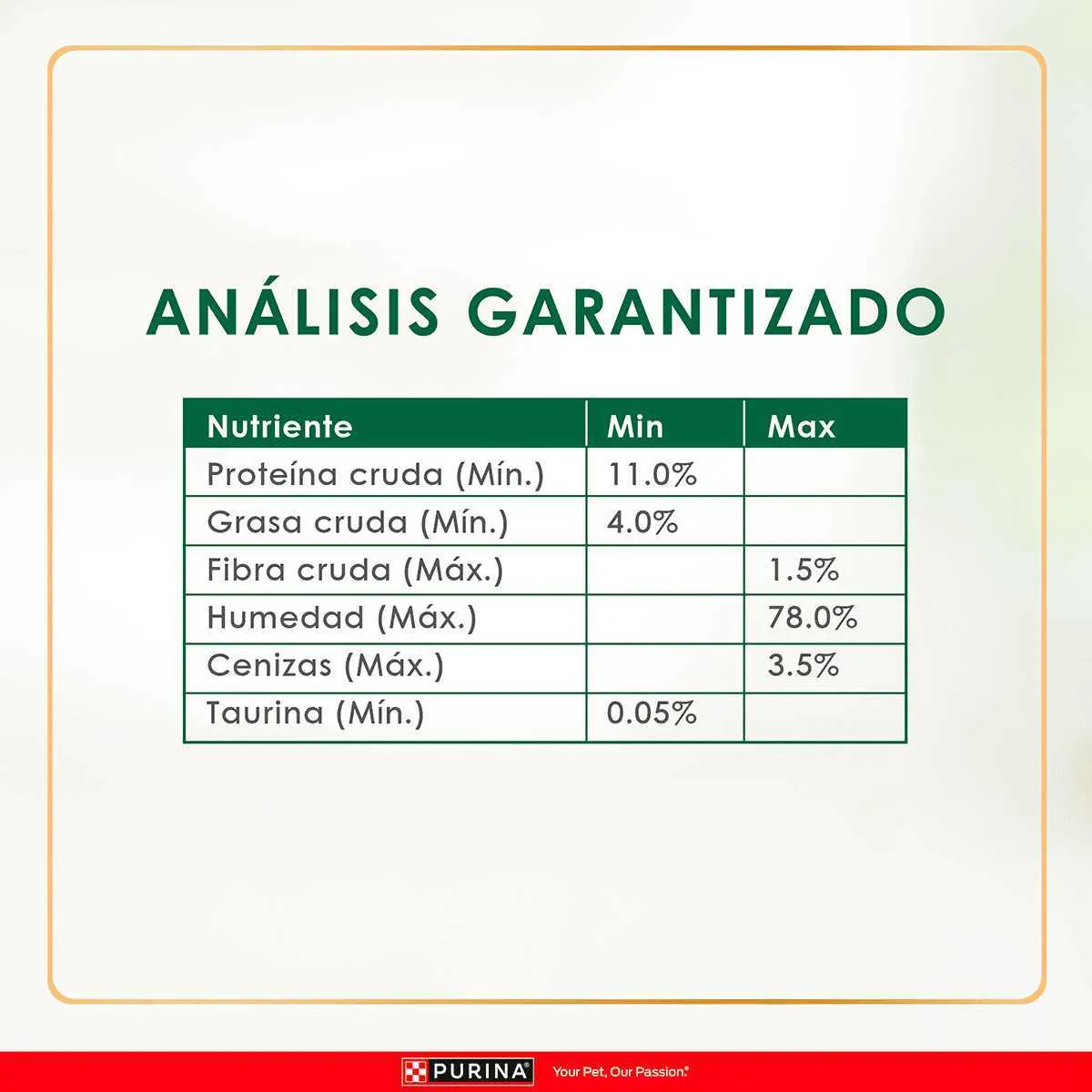 Caldo de pollo, pollo, subproductos de carne, hígado, pescado, pavo, gluten de trigo, subproductos avícolas, sabores artificiales y naturales, harina de soja, concentrado de proteína de soja, fosfato de calcio, tripolifosfato de sodio, goma guar, cloruro de potasio, color añadido, sal, taurina, carragenano, goma de algarrobo, cloruro de colina, sulfato de zinc, mononitrato de tiamina, sulfato ferroso, suplemento de vitamina E, niacina, sulfato de cobre, sulfato de manganeso, pantotenato de calcio, suplemento de vitamina A, complejo de menadiona bisulfito de sodio (fuente de actividad de vitamina k), clorhidrato de piridoxina, suplemento de riboflavina, suplemento de vitamina B12, biotina, ácido fólico, suplemento de vitamina D-3, yoduro de potasio