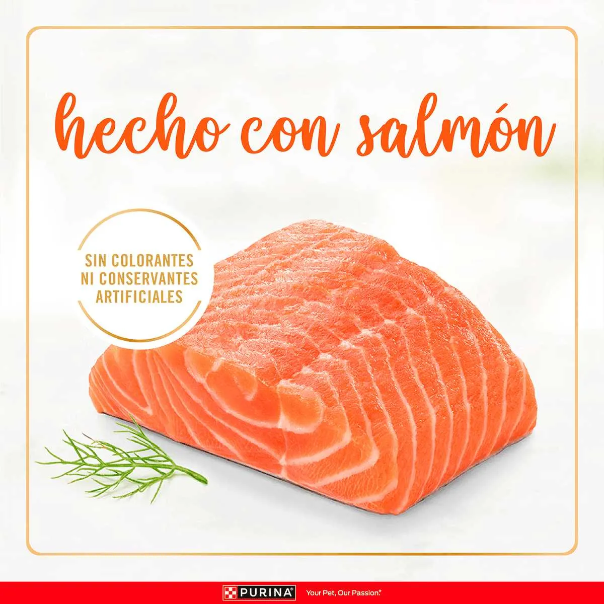 Salmón, hígado, subproductos cárnicos, caldo de pescado, pescado, pavo, sabores artificiales y naturales, fosfato tricálcico, color agregado, goma guar, sal, MINERALES [cloruro de potasio, sulfato de magnesio, sulfato de zinc, sulfato ferroso, sulfato de cobre, manganeso sulfato, yoduro de potasio], taurina, Red 3, VITAMINAS [mononitrato de tiamina (vitamina B-1), suplemento de vitamina E, niacina (vitamina B-3), pantotenato de calcio (vitamina B-5), suplemento de vitamina A, menadiona sodio bisulfito complejo (vitamina K), clorhidrato de piridoxina (vitamina B-6), suplemento de riboflavina (vitamina B-2), suplemento de vitamina B-12, biotina (vitamina B-7), ácido fólico (vitamina B-9), vitamina D 3 suplemento], nitrito de sodio (para promover la retención del color).